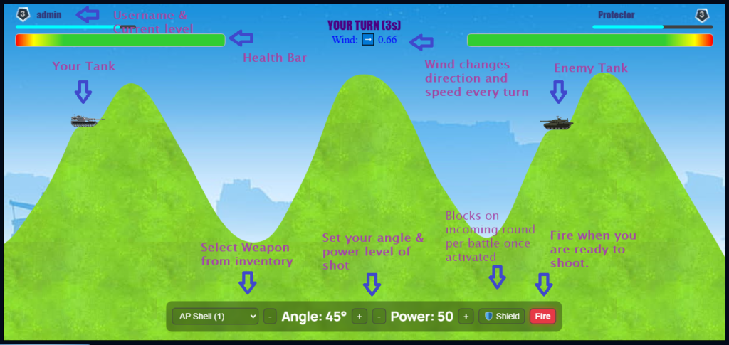 The Battle Arena is where all PvP or Mine battles take place. You can select any tank model which you own in Your Garage via the Base and the selected tank will always be the one automatically loaded in the Battle Arena. Purchase weapons via the Weapons Shop to increase your chances of winning the battle. The battle is artillery style game play and turn based, you will have 15 seconds per turn to set the power and angle of your shot per turn. You will find the HP bars of your tank as well as your your opponent’s tank at the top of the screen below your names, the bars may differ in total HP depending on the model and level of tank selected. The wind may change direction and speed every turn and you will have to compensate for this when deciding the angle & power of your next shot. Click fire button once you are ready to shoot during your turn. Both players will receive a set amount of XP and Gold at the end of each battle which can be viewed on the battle end screen.