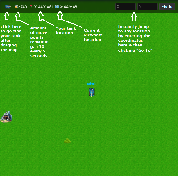 The game features an open world map which is procedurally generated as players explore it. Only areas which have already been explored by players can be viewed via the map dragging function, any previously unexplored areas of the map will display as blank open grassland. To drag the map, simply hold right click on your mouse and drag the map in any direction you desire, release the mouse button to stop dragging. Your tank can travel to any location by clicking anywhere on the map. Once movement is initiated by clicking the desired destination, your tank will travel smoothly to the location unless intercepted by another tank or crashing into a mine which would redirect you to the battle arena. Double click to stop movement or set a new destination.